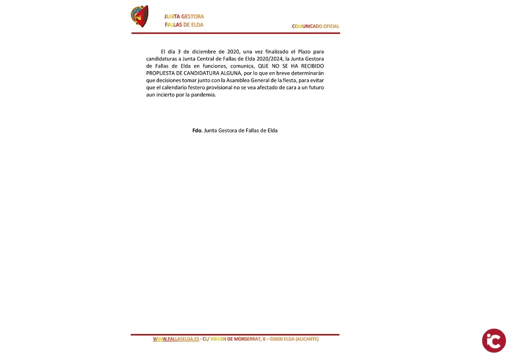 Comunicado de la Junta Gestora de la Junta Central de Fallas de Elda por la que anuncia que, pasado el plazo para la presentación de candidaturas, no se ha recibido propuesta de candidatura alguna.