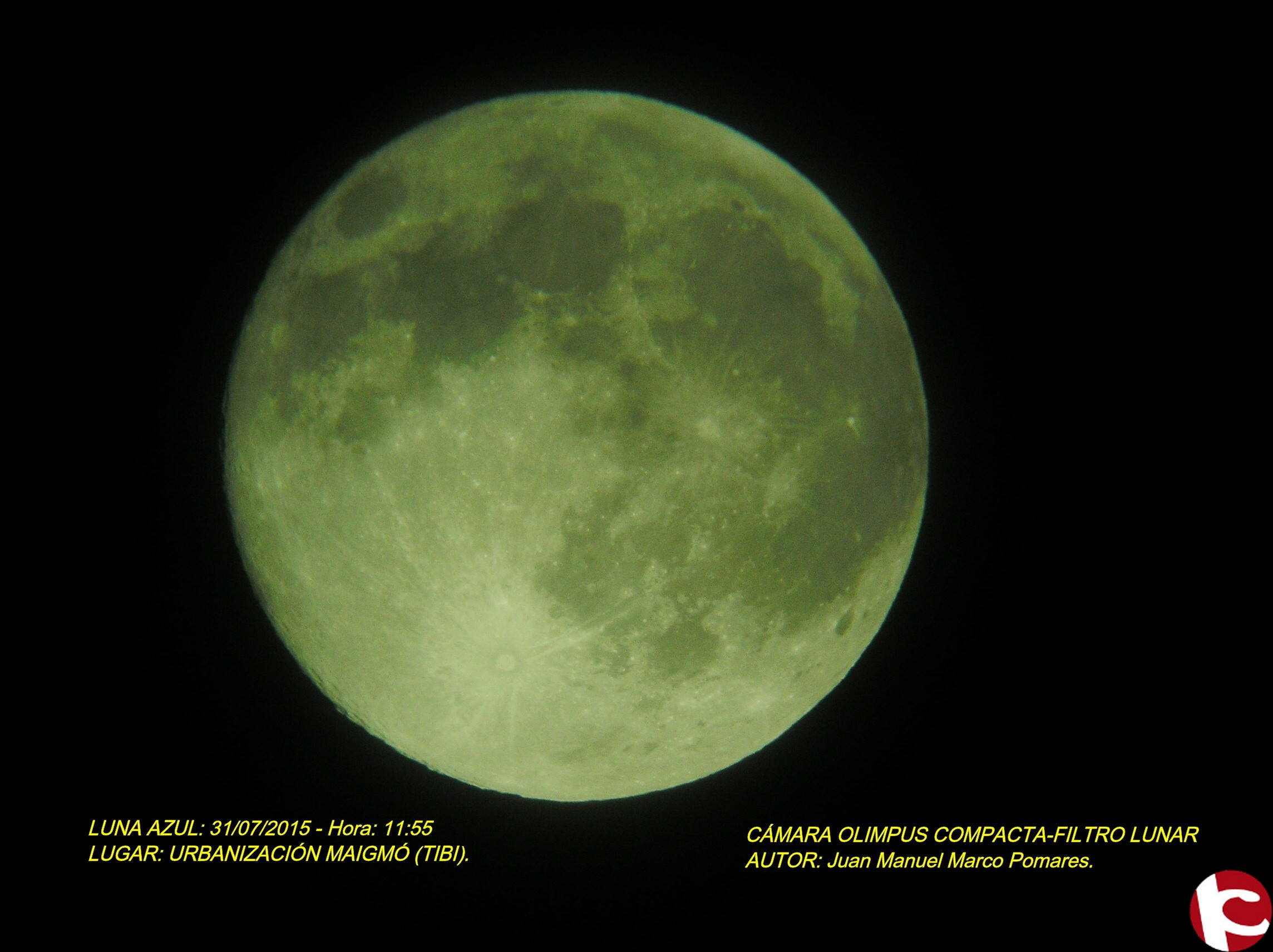 Os ofrecemos una foto de la Luna llena azul realizada desde la urbanización Maigmó en Tibi, con una cámara digital compacta, colocada directamente sobre el ocular de un telescopio catadióptrico de 125 mm. F/10. Esperamos os guste.