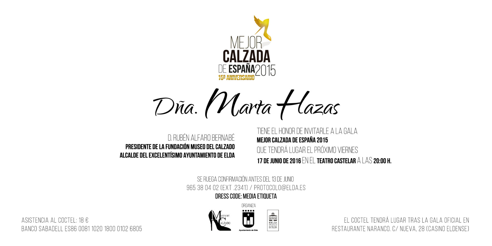 El jurado de la decimoquinta edición del certamen de la Mejor Calzada de España 2015 decidió conceder el premio a la actriz Marta Hazas, que se desplazará a Elda el próximo viernes 17 de junio, para asistir a las ocho de la tarde a la gala donde se le entregará el galardón.