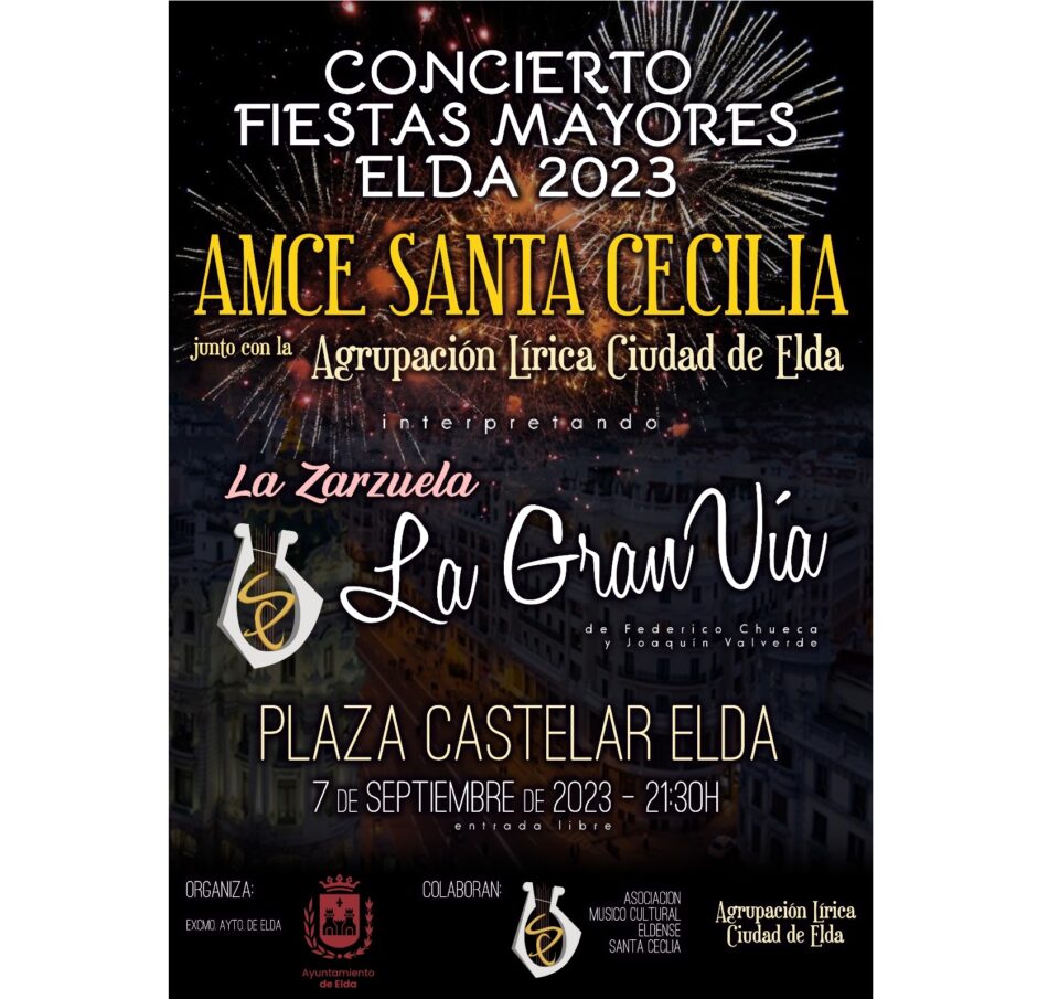 6 de septiembre de 2023.- El Ayuntamiento de Elda, a través de la Concejalía de Cultura, organiza mañana jueves, a partir de las 21.30 horas, el tradicional concierto ofrecido por la AMCE Santa Cecilia con motivo de las Fiestas Mayores 2023. Este año también participará en el evento la Agrupación Lírica Ciudad de Elda.