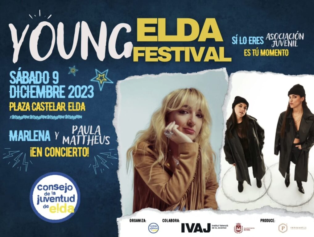 El Young Elda Festival, organizado por el Consejo Local de la Juventud en colaboración con el Ayuntamiento de Elda y el IVAJ, se celebrará el sábado 9 de diciembre en la Plaza Castelar y dará comienzo a las 17.00 horas con la apertura de los stands de las diferentes asociaciones, entidades y colectivos de carácter juvenil que participan en la feria, donde también habrá talleres, animación y actividades infantiles y juveniles. A las 20.00 horas comenzarán las actuaciones de Paula Mattheus y Marlena. Toda la programación es de carácter gratuito.