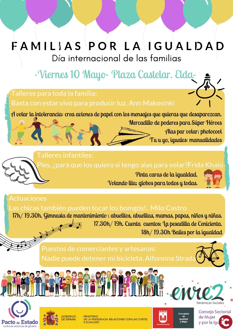 La Concejalía de Igualdad y Mujer del Ayuntamiento de Elda y el Consejo Sectorial de la Mujer y por la Igualdad han organizado la jornada ‘Familias por la Igualdad’, que se celebrará el viernes 10 de mayo en la Plaza Castelar, de 17 a 21 horas, y cuya temática es la educación en valores igualitarios y contra la violencia de género para formar y sensibilizar en el entorno familiar.