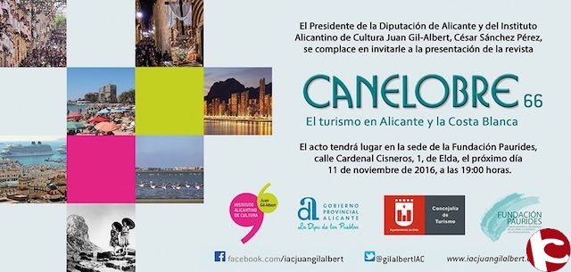 La Fundación Paurides acogió hoy viernes 11 de noviembre, a las 19 horas, la presentación del número 66 de la revista Canelobre, editada por el Instituto Juan Gil-Albert, dependiente de la Diputación Provincial de Alicante. La revista tiene como tema El Turismo en Alicante y la Costa Blanca, cuenta con textos históricos sobre el turismo alicantino y se ilustra con más de 500 imágenes y 30 mapas de la provincia, abarca 450 páginas en las que hay 40 artículos de 48 autores, todos ellos referidos al turismo que fue y al futuro turístico de la provincia. Debido a la gran cantidad de información que contiene ya se ha convertido en un documento de referencia sobre turismo.