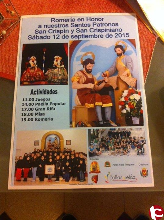 Las Fiestas de Fallas de Elda están a la vuelta de la esquina, y como ya es tradicional este sábado 12 de septiembre se celebró la Romería de nuestros Santos Patronos San Crispín y San Crispiniano. El dia estuvo cargado de actos y eventos organizados por la Mayordomía de San Crispín y San Crispiniano, los cuales comenzaron desde primera hora de la mañana hasta bien entrada la tarde, cuando a las 19:00 horas y portados por todas las comisiones de la ciudad, Junta Central de Fallas y nuestros Cargos Oficiales 2015, fueron trasladados en Romería hasta la Iglesia de la Inmaculada, dónde aguardarán hasta la Procesión en su honor.