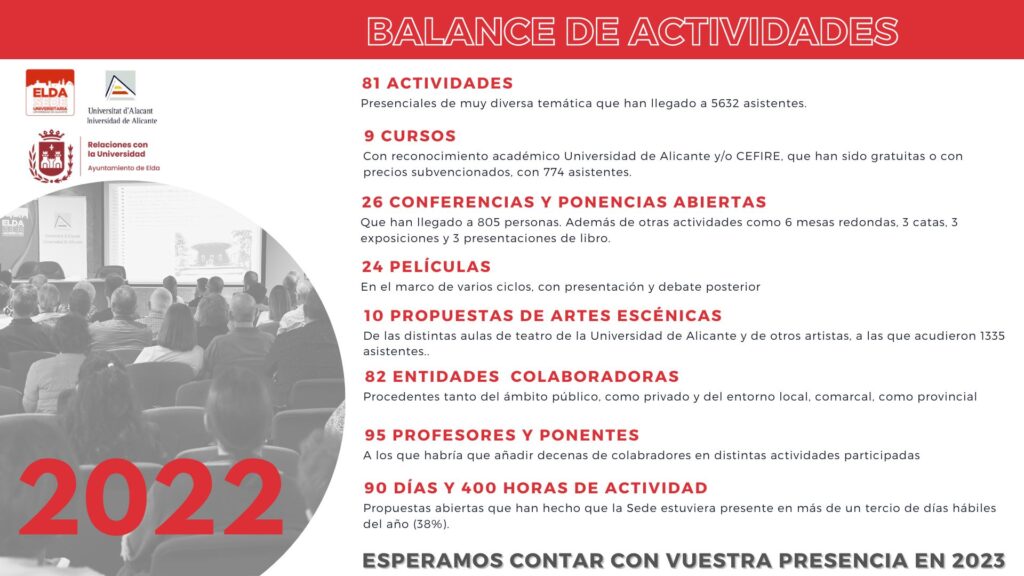 La Sede de la Universidad de Alicante en Elda cerró el año 2022 con cifras récord tanto de actividades como de participantes