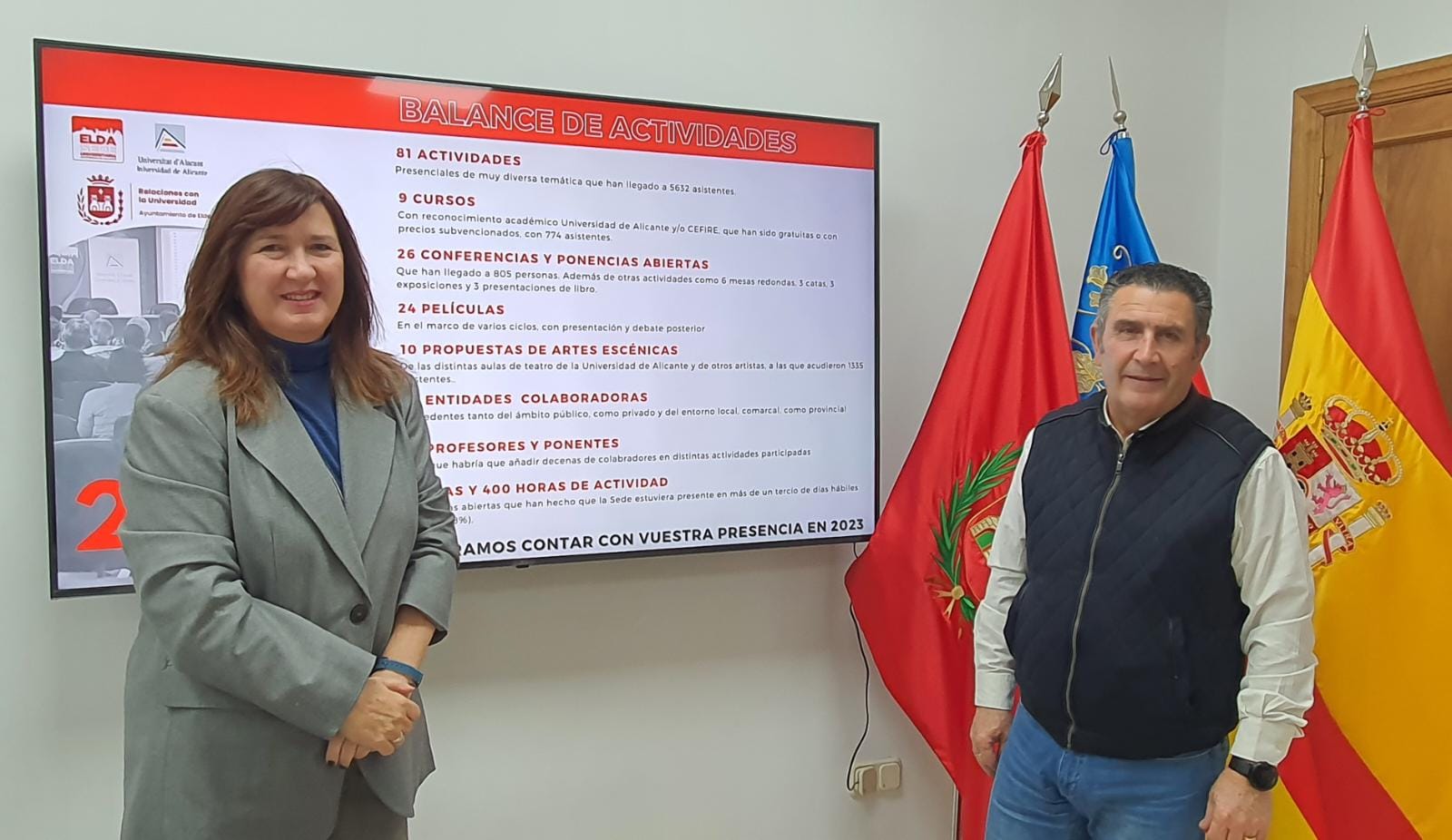 18 de enero de 2023.- El concejal de Relaciones con la Universidad, Amado Navalón, y la directora de la Sede de la Universidad de Alicante en Elda, Rosario Navalón, han presentado esta mañana el balance de las actividades desarrolladas por la entidad universitaria eldense a lo largo de 2022, con un resultado altamente positivo que supera con creces los buenos resultados del año anterior.