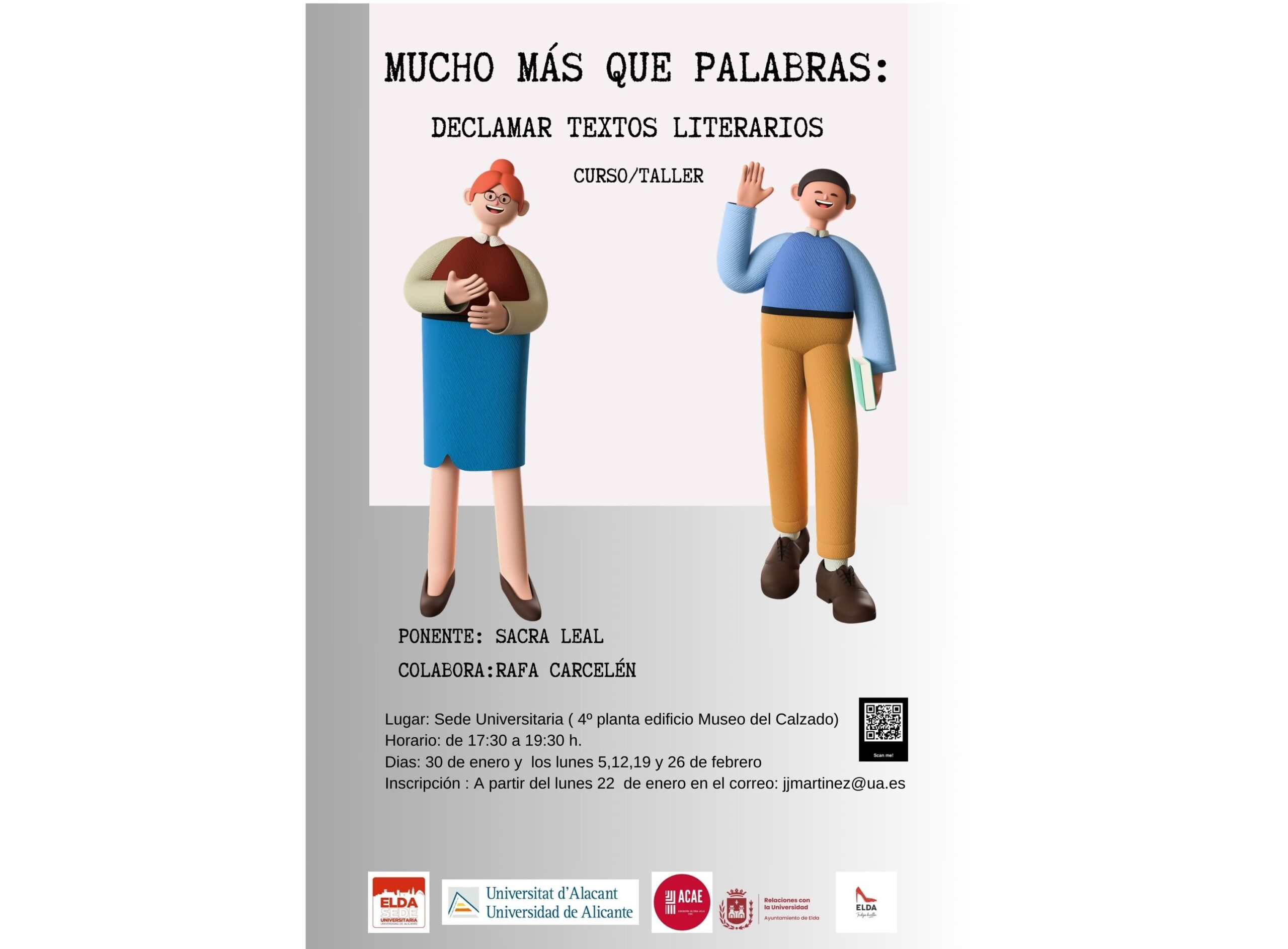 19 de enero de 2024.- La Sede Universitaria de la UA en Elda organiza el Taller ‘Mucho más que palabras: declamar textos literarios’, un curso destinado a ofrecer formación para la lectura en público de textos literarios.