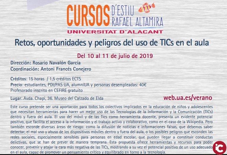 Els col·lectius implicats en leducació de xiquets i adolescents necessiten eines per a fer un millor ús de les Tecnologies de la Informació i la Comunicació (TIC) dins i fora de laula. Amb aquest objectiu la Seu Universitària dElda de la UA imparteix, a partir de demà dimecres 10 de juliol a les 10 hores, el curs destiu «Reptes, Oportunitats i Perills de lÚs de TIC a lAula», al Museu del Calçat de la localitat. José Carlos Ferrándiz, agent delegat de Participació Ciutadana en la Comissaria dElda-Petrer, impartirà la conferència inaugural «Seguridad en internet. Prevención, responsabilidad y consecuencias jurídicas de los actos en redes».