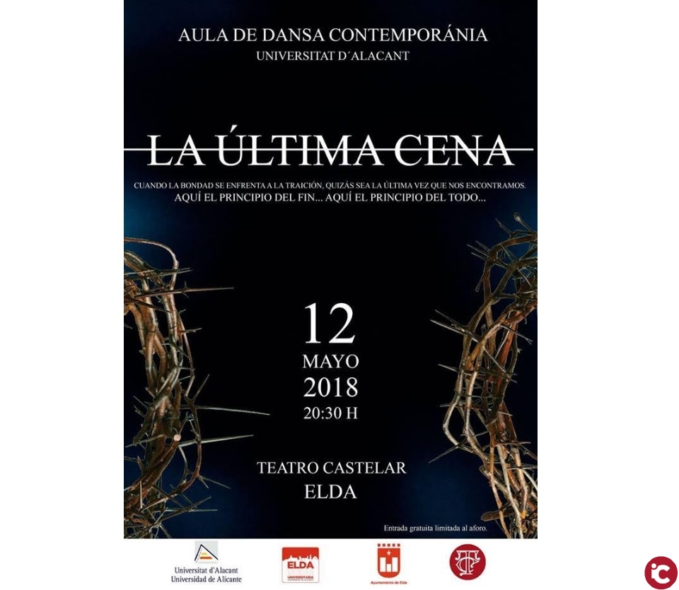 El sábado, día 12 de mayo, a las 20’30 h. se presentará en el Teatro Castelar el espectáculo de artes escénicas «La última cena» bajo la dirección de Carlos Peñalver del Aula de danza contemporánea de la Universidad de Alicante, de la mano de la Sede Universitaria de Elda.