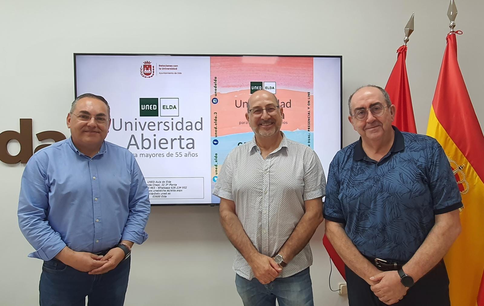 6 de julio de 2023.- La UNED Aula de Elda ha dado a conocer esta mañana los plazos de matriculación de su oferta formativa para el próximo curso. El concejal de Relaciones con la Universidad, Enrique Quílez, el coordinador de la sede de la UNED en Elda, José Manuel Guardia, y el responsable del Negociado de Alumnado, Antonio Melgarejo, han presentado también el balance de matriculaciones del curso pasado y el calendario de actividades previstas para el curso 2023-24.