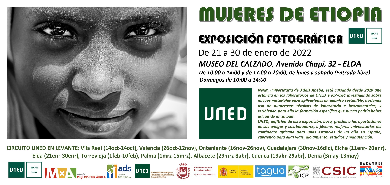 Bajo el título “Mujeres de Etiopía”, la muestra se expone en el MUSEO DEL CALZADO, Avenida Chapí, 32 de ELDA del 21 a 30 de enero de 2022 de 10:00 a 14:00 y 17:00 a 20:00 de lunes a sábado, y domingos de 10:00 a 14:00. Dicha exposición está vinculada a un proyecto de apertura de pozos para facilitar el acceso al agua en este país africano, uno de los más pobres del planeta.