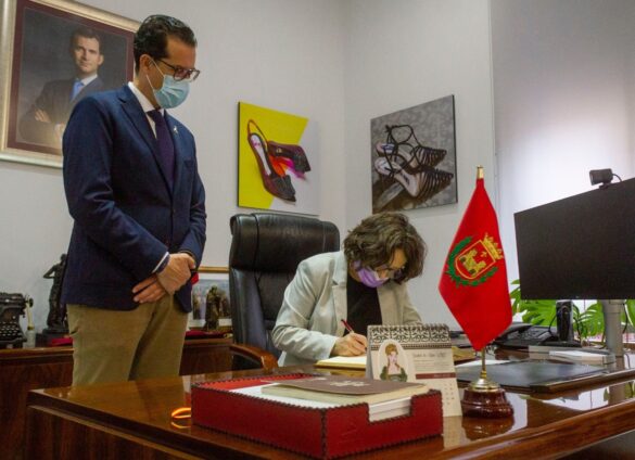 Rubén Alfaro ha recibido a Mónica Oltra en el vestíbulo del Ayuntamiento, donde le ha mostrado la vara de mando de Manuel Azaña. A continuación, la vicepresidenta de la Generalitat ha firmado en el Libro de Honor de la ciudad. El alcalde de Elda, acompañado de la concejala de Bienestar Social, Alba García, ha dado la bienvenida a la vicepresidenta del Consell y ha indicado que “aunque coincidimos en muchas ocasiones en Valencia, para mí es un honor que esté hoy en nuestra ciudad. Es una visita importante porque vamos a tener una reunión con las trabajadoras sociales y con el equipo técnico y directivos del IMSSE”. Alfaro ha recordado que “desde el año 2015, cuando comenzó a caminar el Gobierno del Botánico y también el gobierno progresista de nuestra ciudad, mantenemos una política muy comprometida con las personas