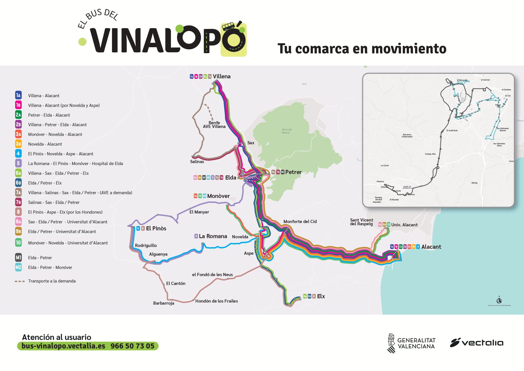 En concreto, la red de autobús inteurbano que opera en la comarca pasará a denominarse Bus del Vinalopó y contará con más frecuencias. Además de mejorar la conectividad del Alto y Medio Vinalopó con Elche y Alicante mediante 16 líneas regulares, mejorará las conexiones de las dos líneas metropolitanas (M1 y M2) que conectan Elda con Petrer y Monóvar y que recuperan los servicios que se ofrecían hace unos años. Además, habrá conexiones con los hospitales de Elda y del Vinalopó, así como con la Universidad de Alicante.