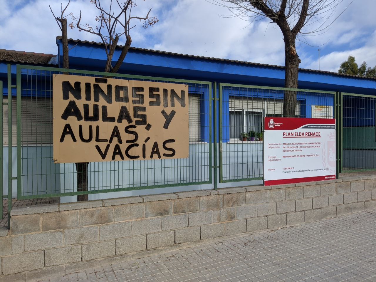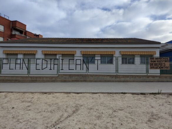 La escuela ha amanecido con carteles colgados de sus vallas con diferentes mensajes reivindicativos. Las familias, hartas de futuras promesas, piden voluntad política para dar por terminado el Plan Edificant de una vez.