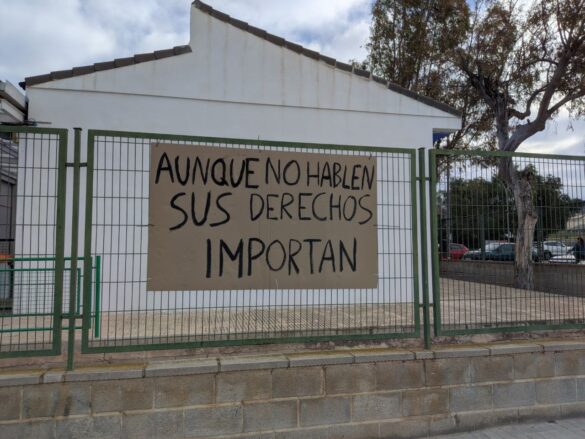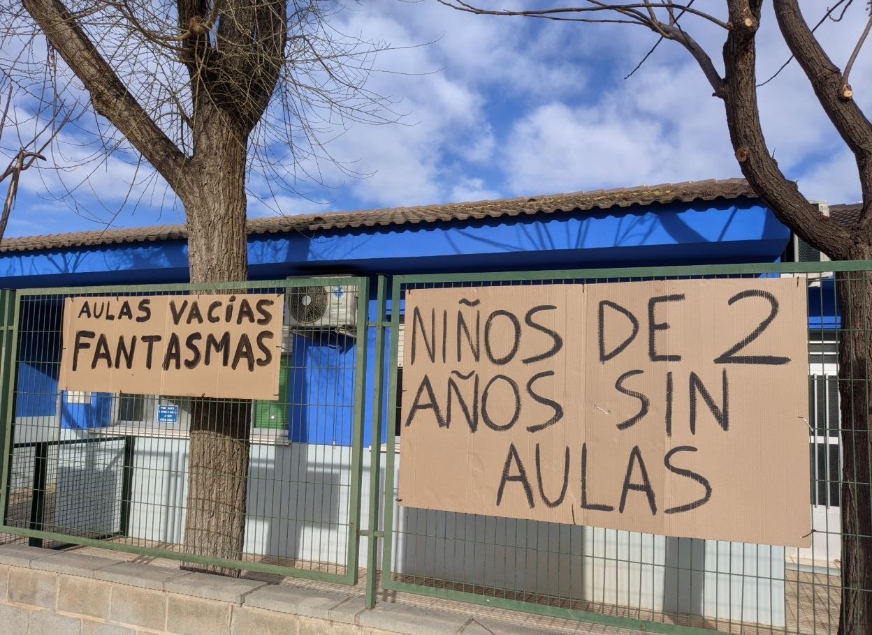 Durante la mañana de ayer, la Escuela de Educación Infantil Nuevo Almafrá amaneció con diferentes carteles colgados de sus vallas exteriores, tanto aquellas que dan a la avda. Filipinas como la de c/ Los Naranjos, con el fin de informar a la comunidad de los problemas existentes. Se podía leer en dichos carteles frases como “niños/as de 2 años sin aulas”, “clases vacías fantasmas”, “sus derechos son vuestros deberes”, “solución ya”, “aunque no hablen, sus derechos importan”, “alumnado sin aulas y aulas vacías”,