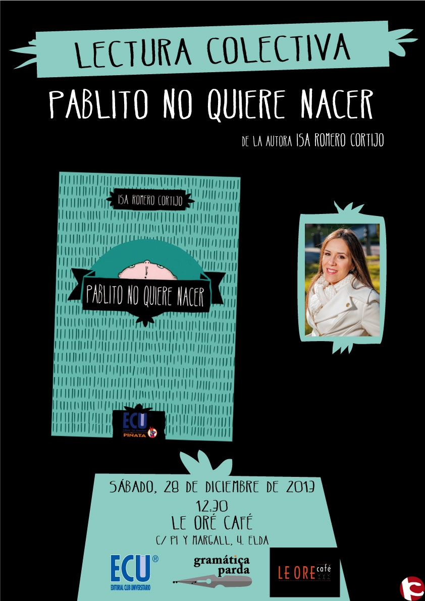En nombre de la Asociación de Escritores Gramática Parda, os mando información sobre la lectura colectiva del libro «Pablito no quiere nacer» de la autora petrerí Isa Romero Cortijo, que tendrá lugar el sábado 28 de diciembre a las 12:30 en la cafetería Le Ore, dentro del contexto de la exposición SolidarizArte: Arte por alimentos, convocada por Octubre negro y a favor de Cruz Roja.