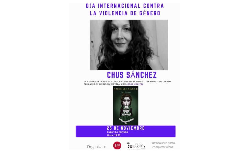 El próximo 25 de noviembre tendrá lugar en la sede de la asociación cultural La Tertulia de Elda y Petrer, un encuentro con la escritora Chus Sánchez, organizado de forma conjunta con la Asociación Cultural Aulas de Elda (ACAE) para presentar su último trabajo Nadie se conoce. La actividad comenzará a las 19:30 horas y será presentado por el profesor Jorge Maestre, que conversará con la autora sobre literatura y maltrato. Chus Sánchez es periodista, trabajó durante años en el Diario Información y actualmente se dedica al marketing digital y la comunicación en redes sociales.