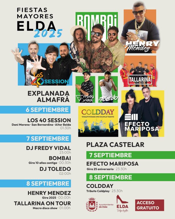 La fiesta arrancará el 6 de septiembre, en la explanada del Nuevo Almafrá, con el show de Los 40 Session que llega a Elda de la mano de Dani Moreno, San Bernardino y Aitor Belda.