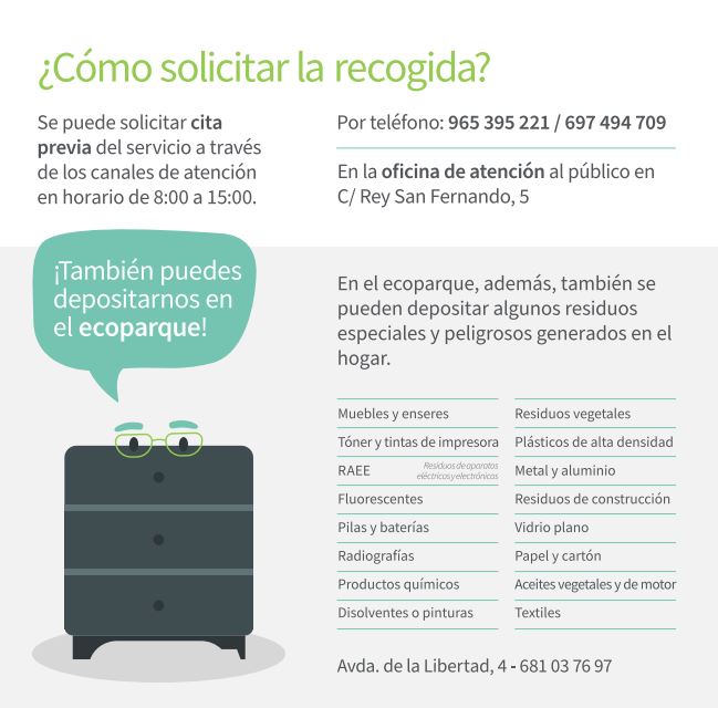 Además, para reforzar esta campaña puerta a puerta, a partir del mes de febrero se instalarán puntos informativos fijos todos los martes para ofrecer información a la ciudadanía acerca del servicio de recogida de enseres gratuito que se realiza a través de Fobesa, y en la que se puede pedir cita a través del teléfono 965 395 221.