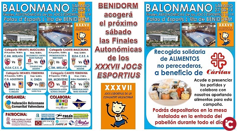 Aprovechando la celebración de este evento deportivo, la FBMCV organiza una recogida solidaria de alimentos NO PERECEDEROS a beneficio de Cáritas. Los participantes en las Finales, y los aficionados que acudan a presenciar los partidos, podrán colaborar con esta iniciativa depositando los alimentos que aporten en la mesa instalada a tal efecto en la puerta del Palau d´Esports L´Illa.En documentos adjuntos incluimos información sobre este evento y los carteles del mismo.