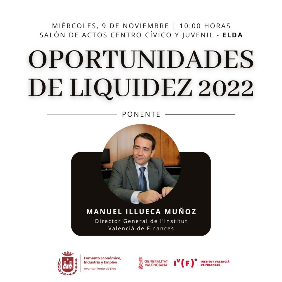 8 de noviembre de 2022.- El director general del Instituto Valenciano de Finanzas (IVF), Manuel Illueca, ofrecerá mañana miércoles, 9 de noviembre, una conferencia en la que, bajo el título ‘Oportunidades de liquidez 2022’, explicará las herramientas que el IVF pone a disposición de las empresas, pymes y autónomos de Elda.