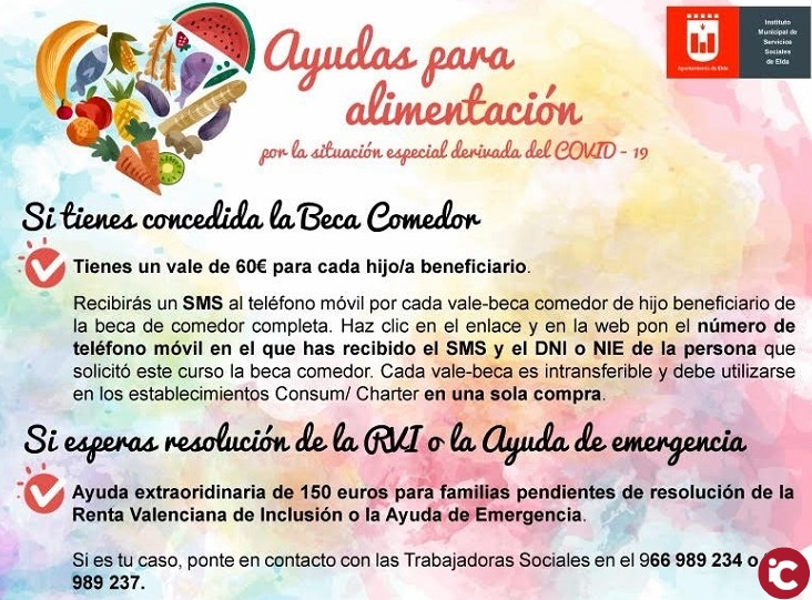 De esta forma, mientras dure la suspensión temporal de la actividad educativa presencial decretada para contener la expansión del coronavirus, en la provincia de Alicante se beneficiarán más de 22.500 alumnos, de los que 840 son de Elda. Durante los próximos días, las familias de cada alumna o alumno beneficiario de la ayuda de comedor recibirán los primeros vales por un total de 60 euros, equivalentes a los primeros 15 días sin clases presenciales, para cada hijo/a beneficiario. Las familias han recibido o recibirán en su teléfono móvil un SMS que incluye un enlace a una página web en la que hay que poner el número del teléfono en el que se ha recibido el mensaje así como el DNI o NIE de la persona que solicitó la beca-comedor.