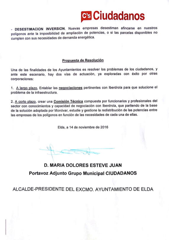 El grupo Ciudadanos de la ciudad de Elda ha presentado esta mñana una moción que presentará en el próximo pleno y que hace referencia a la redistribución de la energía eléctrica en los polígonos industriales de Elda.