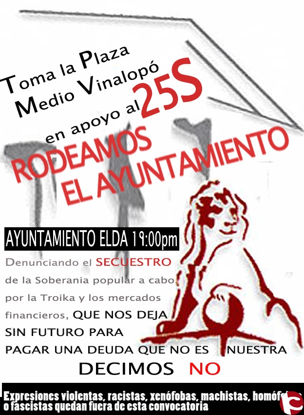 En primer lugar, queremos señalar que el próximo martes día 25 de septiembre, con motivo de la movilización estatal en torno al Congreso de los Diputados, llevaremos a cabo una concentración en la Plaza del Ayuntamiento de Elda a las 19h, mostrando así nuestro apoyo a la protesta de Madrid en contra de la política injusta y anti-democrática de este Gobierno y del caduco sistema capitalista. Toma la Plaza Vinalopó anima a nuestra ciudadanía a participar en el éxito de esta movilización del día 25, para los que no puedan ir Madrid. Además, queremos resaltar el carácter pacífico de esta concentración dejando fuera de esta convocatoria expresiones violentas, racistas, xenófobas, machistas, homófobas o fascistas.