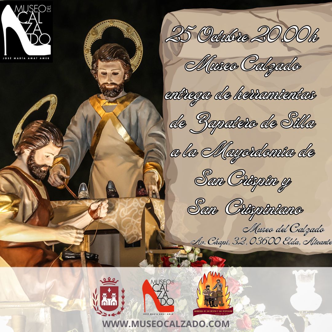 El próximo 25 de octubre a las 20:00 h en Museo del Calzado, se celebra el día del patrón de los zapateros, junto a la Mayordomía de San Crispín y San Crispiniano con un acto de donación de herramientas de zapatero de silla, para completar el atrezzo de la imagen.