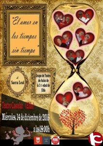 Dentro de las actividades que organiza las Aulas de la Tercera Edad en diciembre, el miércoles día 14 a las 18:00 en el Teatro Castelar, se puso en escena la obra de Sacra Leal El amor en los tiempos sin tiempo a cargo del grupo de teatro de Aulas. La entrada fue libre.