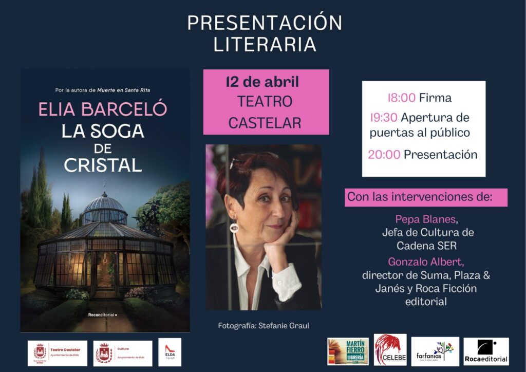 El Teatro Castelar acogerá el próximo viernes, a partir de las 18.00 horas, el acto de presentación de ‘La soga de cristal’, la nueva novela de la escritora eldense Elia Barceló. El acto comenzará a esa hora con la firma de libros en el vestíbulo del teatro y continuará a las 20.00 horas sobre el escenario del coliseo cultural, donde la periodista eldense Pepa Blanes conducirá la presentación de la nueva obra de Elia Barceló.