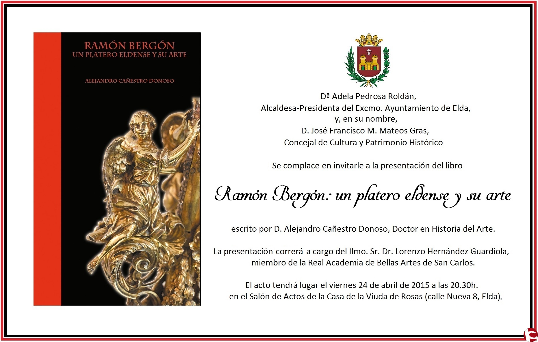 El libro Ramón Bergón: un platero eldense y su arte, escrito por Alejandro Cañestro Donoso, Doctor en Historia del Arte, constituye una nueva aportación al avance del conocimiento de la historia del Arte de la Comunidad Valenciana en tanto que aborda la trayectoria vital y artística de Ramón Bergón, fundador de una de las sagas más relevantes de orfebres del último tercio del siglo XVIII y los primeros años del siglo XIX. Bergón, eldense de nacimiento pero trasladado prontamente a Valencia donde aprende el oficio de platero, ejecutó dos custodias de bellísima estética con destino a la catedral de Murcia para donde hizo, además, otras obras de arte como una corona para la Virgen de la Fuensanta y objetos del ajuar litúrgico y la iglesia de San Pedro Apóstol de Novelda. El libro expone las conclusiones del proyecto de investigación realizado por Cañestro y financiado por la Concejalía de Cultura del Ayuntamiento de Elda que consistió en la búsqueda de información acerca del platero Ramón Bergón en los archivos de la capital del Reino en donde se conservan los fondos relativos al Colegio de Plateros de Valencia, al cual perteneció Bergón. La platería, aún necesitada de estudios que revelen la amplitud y dimensión del tema, así como su lógico impacto tanto artístico como social, representa una manifestación artística de primer orden.