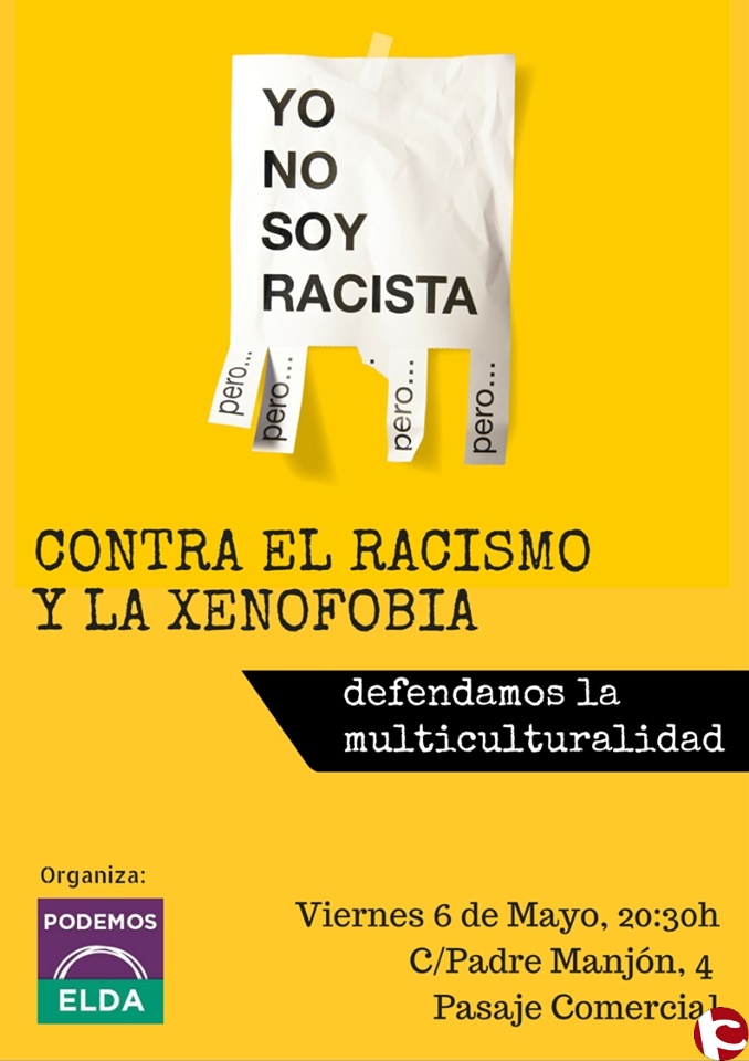 Este viernes, 6 de mayo, tendrá lugar un coloquio sobre racismo y xenofobia organizado por Podemos Elda. El acto se realizará en el local sito en la calle Padre Manjón, 4, pasaje comercial.