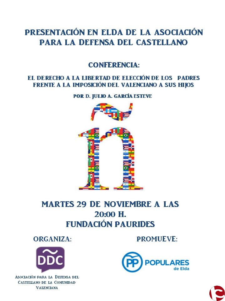 La Asociacion para la Defensa del Castellano junto al Partido Popular de Elda ha organizado una conferencia que llevará por título “El Derecho a la libertad de elección de los padres frente a la imposición del valenciano a sus hijos”. La conferencia será impartida por el filólogo D. Julio García Esteve.