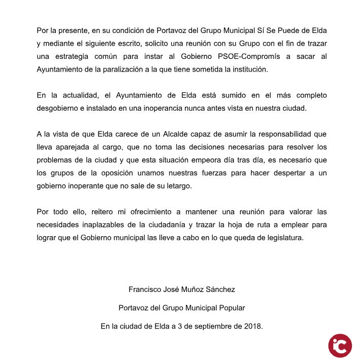 Por último el Portavoz Popular ha indicado que ha enviado una carta a los portavoces de los distintos grupos municipales solicitando una reunión para tratar la situación de desgobierno y letargo que ha mantenido el Gobierno PSOE-Compromís durante estos tres años.