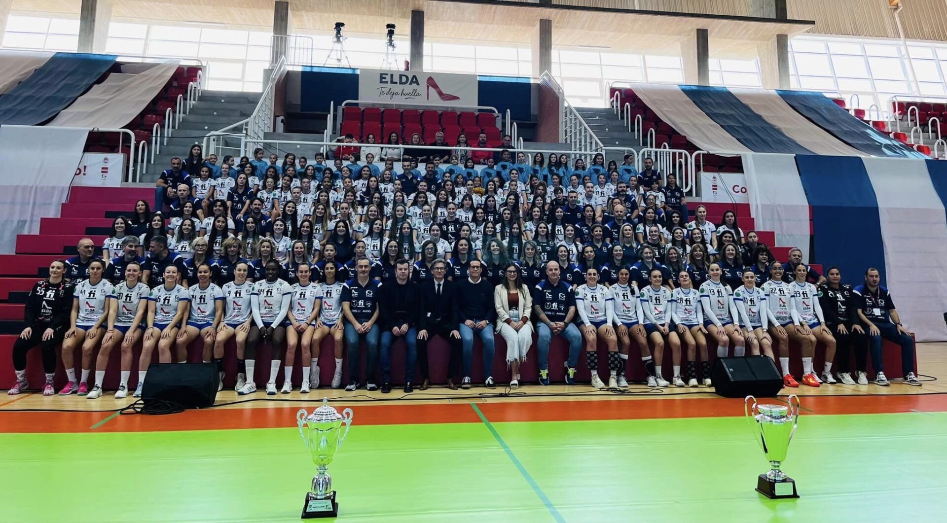 MIGUEL SANTIAGO RICO. En la mañana del sábado tuvo lugar en el Florentino la puesta de largo del CBMF Elda Prestigio 2023-2024. La pista verde de la Liga Guerreras Iberdrola sirvió como escenario por el que desfilaron en sendas moquetas azules cerca de 160 balonmanistas y unas 35 oficiales, en total, cerca de 200 personas de todas las edades. En el pasillo que permitía el acceso a la telescópica donde se fotografiaron todas las balonmanistas se ubicaron algunos de los más grandes trofeos conquistados por el club blanquiazul en su etapa dorada: 4 Ligas, 2 Copas de La Reina, 2 Supercopas, 1 Copa ABF y un subcampeonato de la Copa de Europa EHF.
