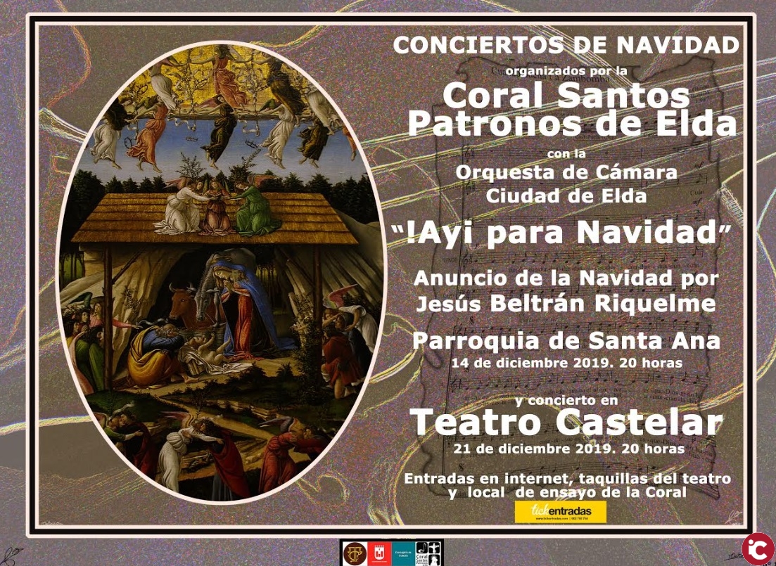 Un año más y fiel a su cita con el invierno llega a Elda la Navidad y con ella vuelve de la mano la Coral Santos Patronos de Elda, un plus más de Elda Ay, para Navidad. Seguramente la Navidad será la cita más entrañable del año para muchísima gente y en estos momentos la Coral Santos Patronos de Elda, junto a la Orquesta de Cámara Ciudad de Elda quiere estar presente en los hogares y en la sociedad eldense, si, Ay, para Navidad.