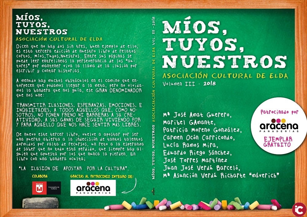 Por tercer año consecutivo lanzamos el tercer ejemplar de relatos cortos que bajo el ya conocido título «MIOS, TUYOS, NUESTROS», recoge algo más que unos simples relatos, recoge una ilusión por escribir, un esfuerzo por intentar crear historias que puedan llegar a los lectores, un aprender y mejorar si cabe, un luchar por mantener el compromiso que nos hemos propuesto de ofrecer cada año lo mejor de nosotros mismos a través de unos humildes relatos, al tiempo que pretendemos generar en los lectores el despertar cultural que todos llevamos dentro.