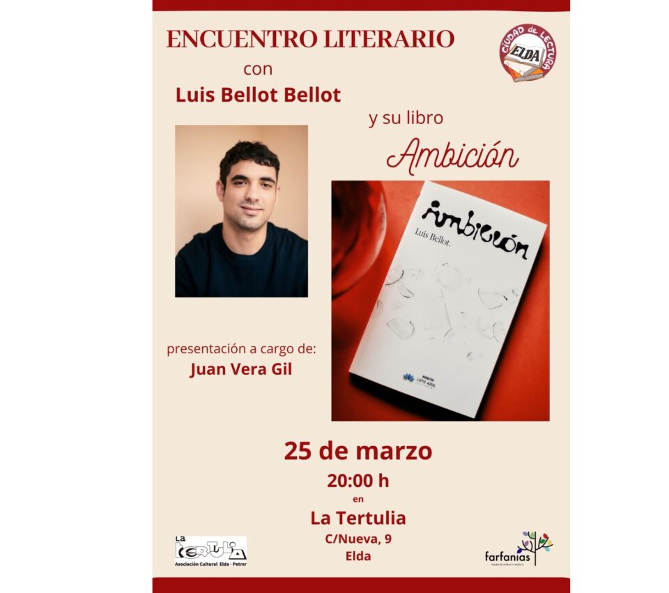La Asociación Cultural “La Tertulia de Elda y Petrer” acoge el próximo lunes 25 de marzo, a las 20:00 h, en su sede de la C/ Nueva, nº 9 de Elda, la presentación de la novela “Ambición” escrita por Luis Bellot Bellot, dentro del ciclo literario de invierno 2024 “Elda Ciudad de Lectura”.