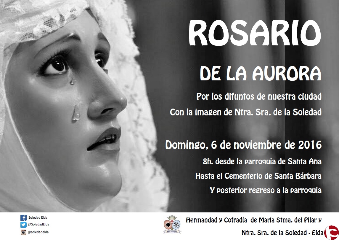 – La Cofradía de Nuestra Señora de la Soledad realizará el próximo Domingo, día 6 de Noviembre un Rosario de la aurora por los difuntos, el cual será presidido por su sagrada titular, a las 8 de la mañana desde la Iglesia Arciprestal de Santa Ana hasta el cementerio municipal de Santa Bárbara, y posteriormente regresando a la Iglesia de Santa Ana de nuevo.