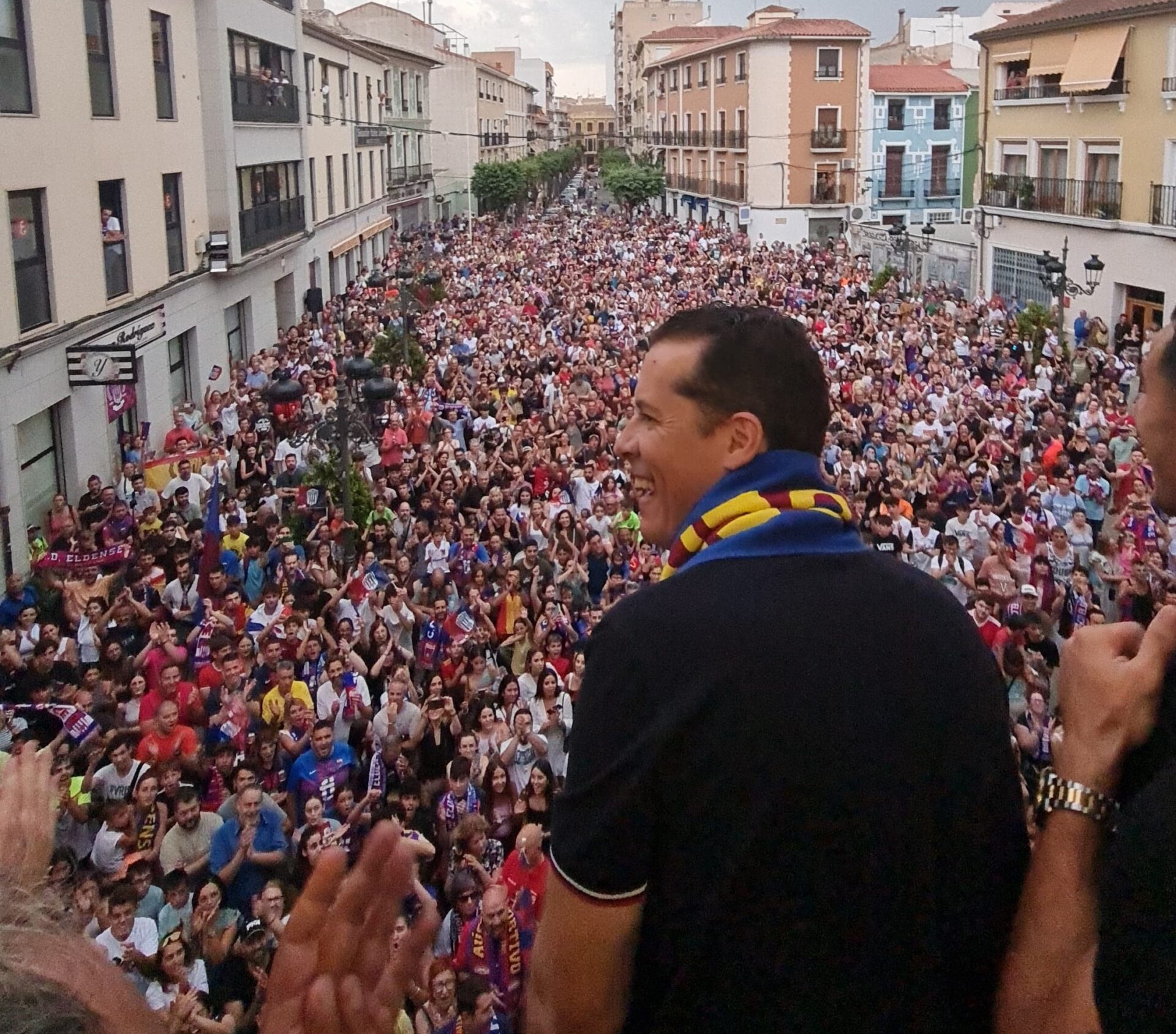 A continuación, los jugadores y el alcalde Rubén Alfaro han salido a los balcones consistoriales para saludar a los cientos de seguidores azulgrana que esperaban con ahínco a sus ídolos. El regidor eldense ha agradecido a los jugadores, a los técnicos y a la directiva, con Pascual Pérez a la cabeza,