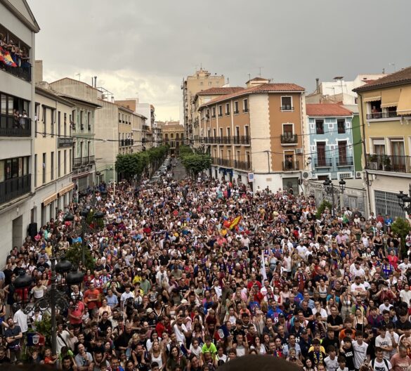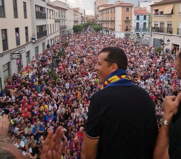 27 de junio de 2023.- Más de 2.300 personas se dieron cita ayer por la tarde frente al Ayuntamiento de Elda para celebrar el ascenso del Eldense a Segunda División junto a la plantilla, técnicos y directiva. Con motivo de la recepción oficial en el Consistorio, cientos de aficionados y aficionadas azulgranas acudieron a la Plaza de la Constitución para saludar a los protagonistas del histórico ascenso.
