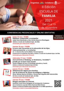 Se trata de una serie de conferencias dirigidas a los padres y madres que quieran obtener claves para mejorar la convivencia en el ámbito familiar. Estas conferencias se realizarán en la Fundación Paurides y serán retransmitidas en las redes sociales del Ayuntamiento de Elda.