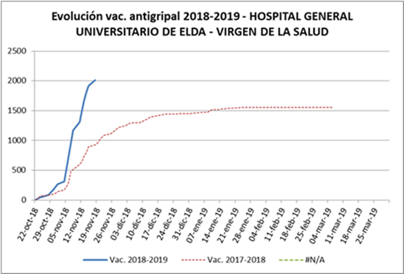 Las coberturas en trabajadores de centros sanitarios también han aumentado respecto a la temporada anterior en estas primeras semanas de campaña. Este aumento ha sido especialmente significativo en el ámbito de la Atención Especializada, donde se ha implantado la estrategia de vacunación en el hall del hospital. Gracias a la misma, y a la labor del servicio de Medicina Preventiva, las dosis administradas en el hospital DUPLICAN a las de la temporada anterior para la misma semana.