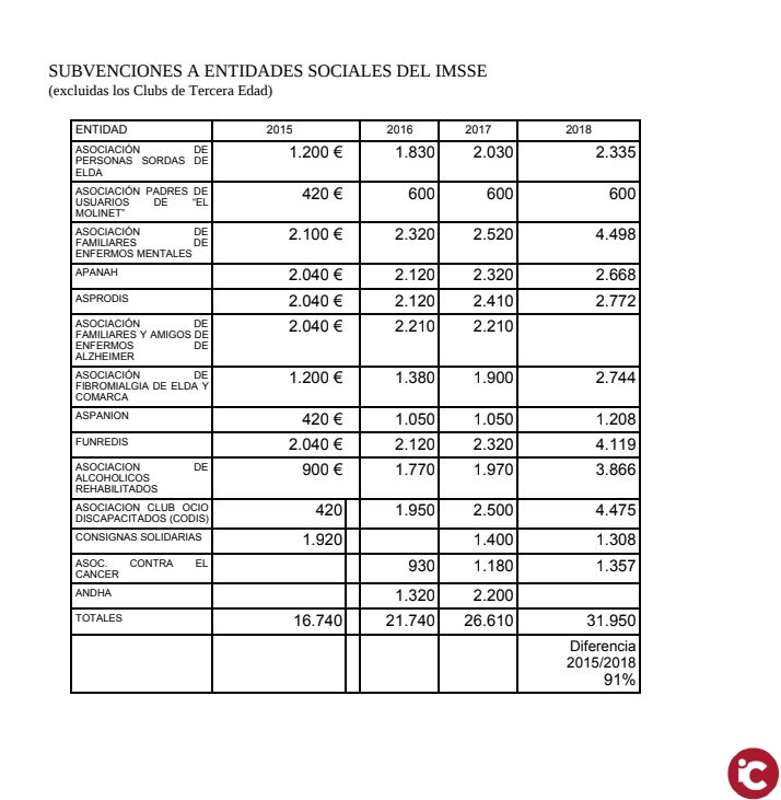 Y 12 entidades sociales también recibirán subvenciones del IMSSE por un importe en total de 31.950 euros, un 91% más en el año 2015. SE tgrata de la Asociación de Personas Sordas de Elda (2.335 €), la Asociación de Padres de Usuarios de “El Molinet” (600 €), la Asociación de Familiares de Enfermos Mentales (4.498 €), APANAH (2.668 €), ASPRODIS (2.772 €), la Asociación de Fibromialgia de Elda y Comarca (2.744 €), ASPANION (1.208 €), FUNREDIS (4.119 €), la Asociación de Alcohólicos Rehabilitados (3.866 €), la Asociación Club Ocio Discapacitados CODIS (4.475 €), Consignas Solidarias (1.308 €) y la Asociación Contra el Cáncer (1.357 €).