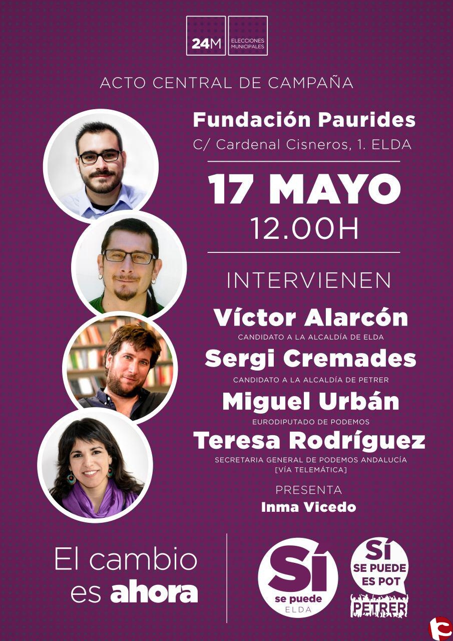 Uno de los principales actos que llevará a cabo la candidatura ciudadana son un mítin conjunto con la candidatura ciudadana Sí es pot Petrer en la Fundación Paurides este domingo, que contará con la presencia del Eurodiputado de Podemos Miguel Urbán y con la colaboración de la Diputada andaluza Teresa Rodríguez, ésta última a través de una conferencia telemática. Para finalizar la campaña, han organizado un concierto para el día 22 de mayo, en el que participarán grupos locales. Asimismo, han manifestado su voluntad de apoyar el acto de Podemos para las elecciones autonómicas el próximo sábado 16 de mayo en la Universidad de Alicante, en el que participará Pablo Iglesias.