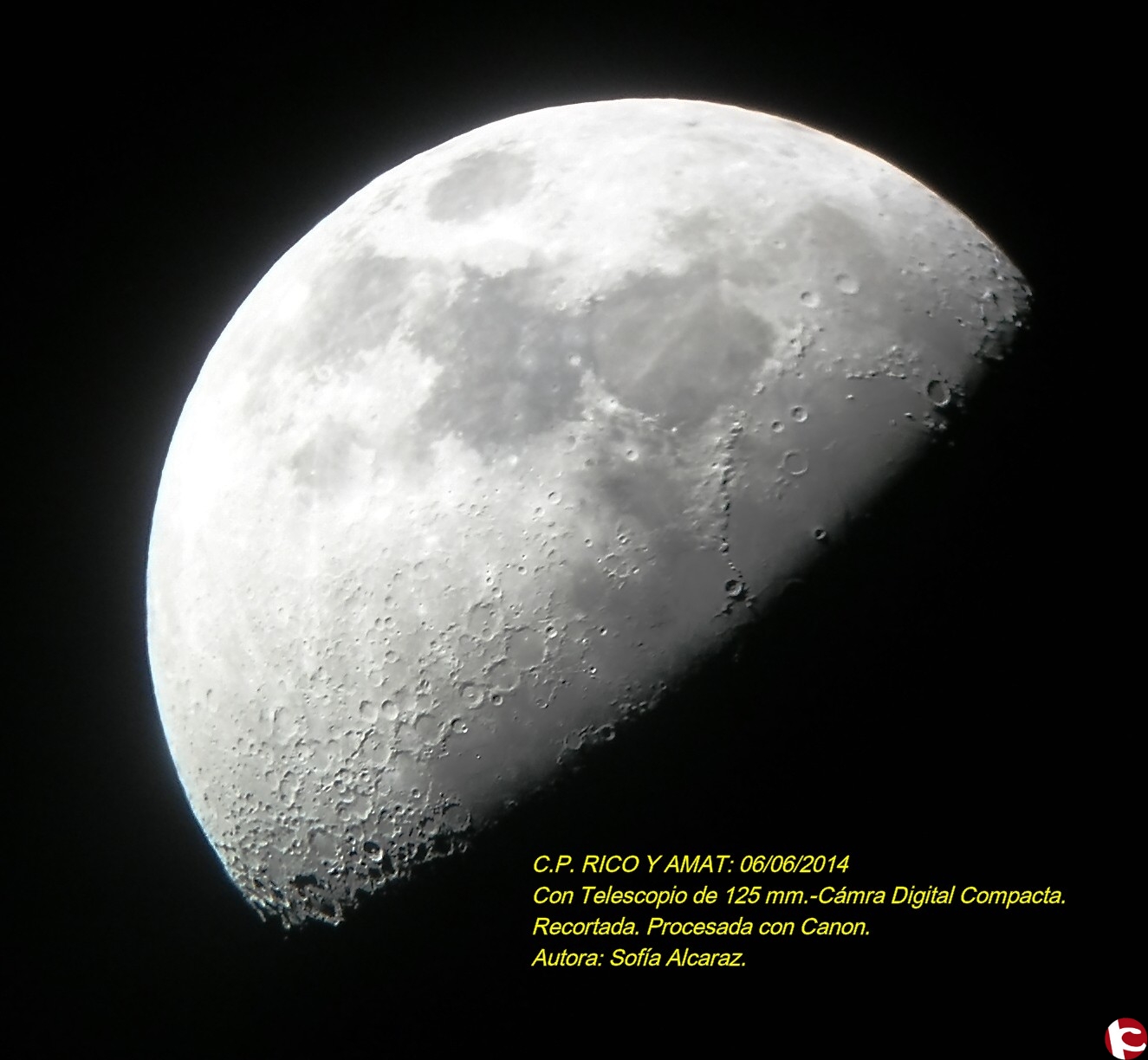 Llegamos al Colegio a las 21 horas, preparando los telescopios y cenando unas sabrosas pizzas que nos ofrecieron, mientras los alumnos/as también cenaban. A partir de las 22 h. comenzamos las observaciones. En el telescopio de 200 mm. de Rafa observamos los planetas Marte y Saturno y con el de 125 mm. de Juanma, la Luna Creciente x40 aumentos y x100. Realizamos unas fotos a la Luna con una cámara digital compacta, colocada a pulso sobre el ocular del telescopio, por Sofía Alcaraz.