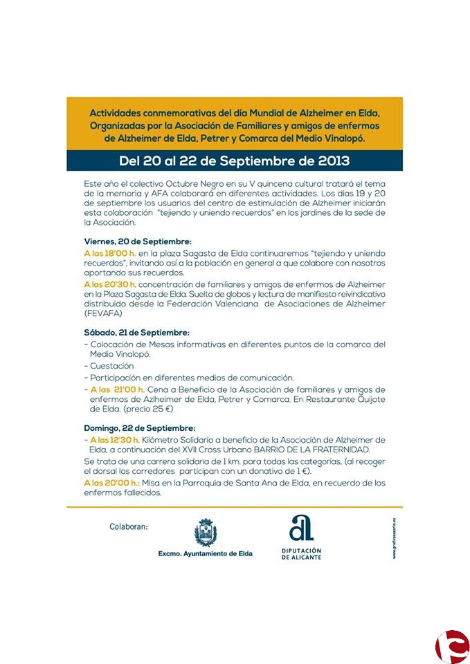 Ayer, viernes 20 de septiembre, con motivo de las actividades conmemorativas del dia Mundial de Alzheimer en Elda, Organizadas por la Asocíación de Familiares y amigos de enfermos de Alzheimer de Elda, Petrer y Comarca del Medio Vinalopó, se organizó en la plaza Sagasta, «tejiendo y uniendo recuerdos». Posteriormente, concentración de familiares y amigos con suelta de globos y lectura de manifiesto reivindicativo distribuido desde la Federación Valenciana de Asoc. de Alzheimer (FEVAFA).