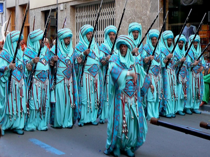 Entre todos estos rituales agonísticos (de agón) se ha de resaltar, especialmente, uno: la peculiar «danza de las espadas» cuyos protagonistas o danzantes se reparten en dos bandos o grupos claramente diferenciados, unos de rostro pintado de negro que se identifican como moros, y los otros que representan a los cristianos. Esta danza tiene diferentes derivaciones en Italia – la «Moresca»- y en España que ha evolucionado hacia la Fiesta de Moros y Cristianos. Hemos de concebir, pues, nuestra Fiesta como una forma historizada de la danza guerrera en la que aparecen los dos característicos bandos dentro de una situación conflictiva y en la que hay intervención de la palabra – parlamento o diálogo- por medio de sus «corifeos» respectivos – embajadores, capitanes, reyes cristiano y moro-, y de cuyo enfrentamiento real y dialéctico surge el triunfo del principio o bando que representa el bien. En este caso el bando cristiano está caracterizado por connotaciones muy claras que demuestran la ideología que sustenta la sociedad bajo cuyos auspicios se celebra la Fiesta.