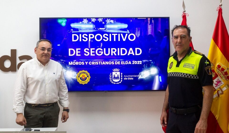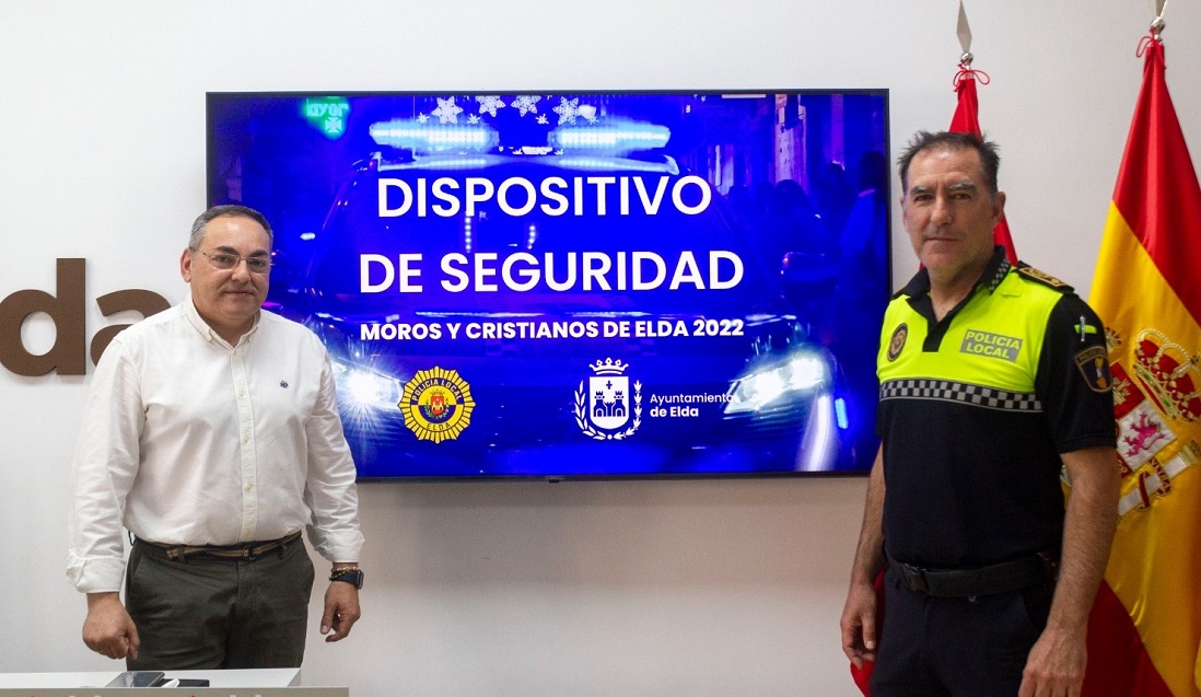 El concejal de Seguridad Ciudadana, Enrique Quílez, y el comisario principal de la Policía Local de Elda, Francisco Cazorla, han dado a conocer esta mañana el dispositivo de seguridad que, con motivo de la celebración de las fiestas de Moros y Cristianos, ha establecido la Policía Local de la ciudad.